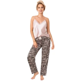 Dámske pyžamo Sheila Donna - vyrobené z jemného saténu - béžové tielko s úzkymi ramienkami s reguláciou - výstrih zdobený čipkou - dlhé nohavice so zvieracím motívom - pás zdobený béžovou mašľou