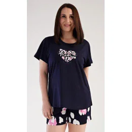 Dámske bavlnené pyžamové šortky Jana. Dámske pyžamo pozostáva z trička s krátkym rukávom a šortiek. Jednofarebné tričko má jemný obrázok v tvare srdca. Šortky majú elastický pás a šnúrku a sú bez vreciek. Použitý bavlnený materiál je príjemný a pružný na dotyk.