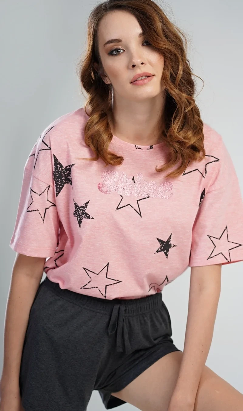 Dámske pyžamové šortky Shine. Pyžamo sa skladá z trička s krátkym rukávom a krátkych šortiek. Tričko s okrúhlym výstrihom a spadnutými rukávmi má lesklý nápis Shine obklopený hviezdičkami. Výrazné tričko dopĺňajú jednofarebné šortky. Použitý materiál je príjemný a poddajný na dotyk. Materiál šortiek a trička má 70 % podiel bavlny.