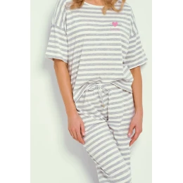 Dámské pyžamo z měkké bavlny s proužky a polyesteru, jemný potisk na hrudi, 3/4 dlouhé kalhoty s ozdobnou šňůrkou v pase.