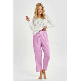 Dlouhé dámské pyžamo MONICA 3459 je ideální volbou pro ženy, které ocení pohodlí při spánku a jemný, ženský styl. Je vyrobeno z měkké, 100% bavlny, dokonale obepíná tělo a zajišťuje pohodlí po celou noc. Tričko s dlouhými rukávy zdobí na přední straně barevný, květinový potisk, zatímco dlouhé kalhoty v kontrastní barvě dodávají soupravě moderní nádech. V pase je měkká guma a ozdobná mašle, které zaručují dokonalé přizpůsobení a estetické zakončení.