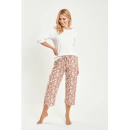 Piżama damska GRACE 3479 to połączenie wygody, kobiecego uroku i starannego wykonania. Górę kompletu stanowi luźna koszulka z wiskozy w modny prążek, z rękawem 3/4 i klasycznym okrągłym dekoltem – doskonała na każdą porę roku. Długie bawełniane spodnie zachwycają subtelnym, kwiatowym printem, który dodaje lekkości i romantycznego charakteru. Całość została zaprojektowana z myślą o swobodzie ruchów i maksymalnym komforcie podczas snu i wypoczynku.