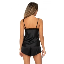 Dámské pyžamo Tiffani black Donna - černá barva - vyrobené z velmi kvalitního saténu - výstřih zdobený krajkou - tenká nastavitelná ramínka - volné šortky - široká guma v tunýlku ozdobená saténovou mašlí