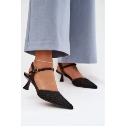 Dámské sandály vyrobené ze směsi ekologické kůže a textilního materiálu jsou stylovým doplňkem ženských outfitů. Kombinace materiálů zajišťuje estetický vzhled a pohodlí při nošení, díky čemuž se model skvěle hodí na různé příležitosti. Obuv je postavena na tenkém podpatku, který jemně zeštíhluje siluetu a dodává lehkost krokům. Špičaté špičky zdůrazňují elegantní charakter a pásek s přezkou a regulací umožňuje správné přizpůsobení noze. Tyto nápadné sandály skvěle doplní jak večerní, tak i elegantnější letní stylizace. Při výběru velikosti se řiďte tabulkou velikostí.