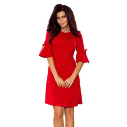 Dámske šaty 217-1 Neva NUMOCO - červená farba - vyrobené z príjemného materiálu - trojštvrťové rukávy - zakončené volánmi a mašľami - dĺžka sukne po kolená