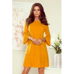 Dámske šaty 228-7 NUMOCO - žltooranžová farba - jemné nariasenie na rukávoch a sukni - okrúhly výstrih - 7/8 rukávy - pohodlný strih Zloženie materiálu: 95% polyester + 5% elastan