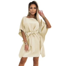 Dámske šaty 287-28 SOFIA NUMOCO - béžové - voľný strih "motýľ" - trojštvrťové rukávy - zaväzovanie v páse - dĺžka po kolenáZloženie materiálu: 95% polyester + 5% elastan