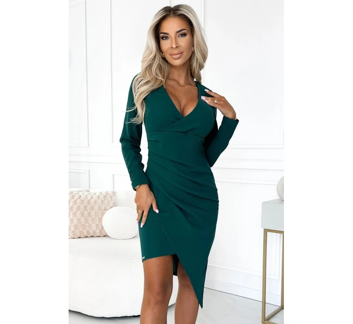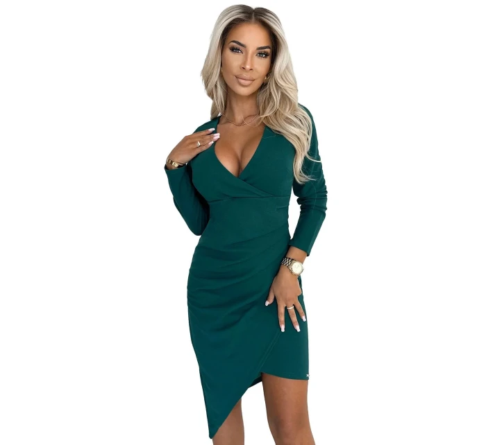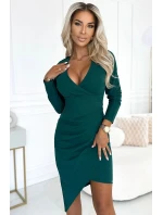Dámské šaty 290-3 NUMOCO - zelená barva - z lehce elastického materiálu - asymetrický střih - otevřený dekolt - s řasenímMateriálové složení: 95% polyester + 5% elastan