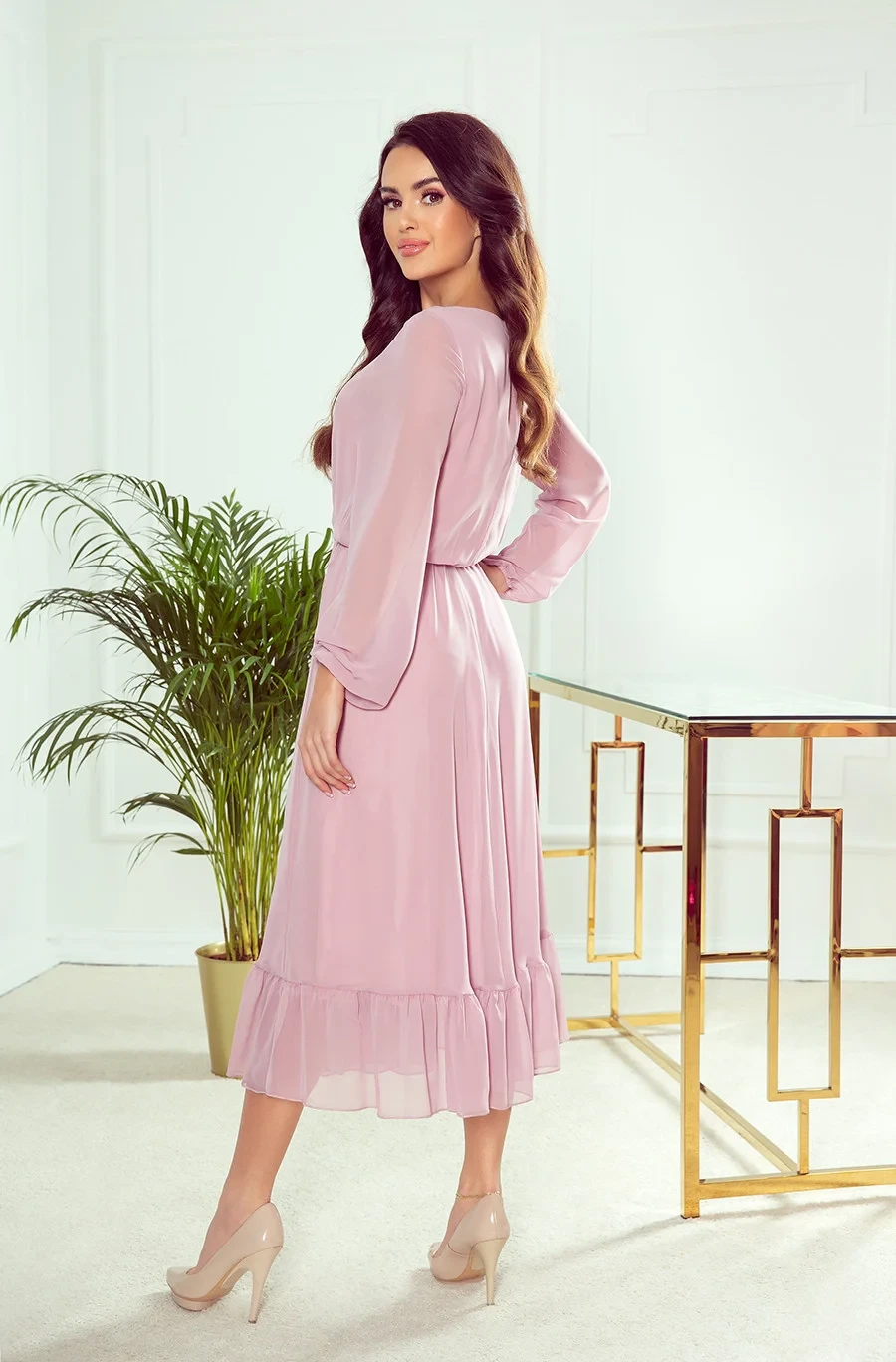 Dámske šaty 304-1 NUMOCO - staroružové - výstrih do V - dlhé šifónové rukávy - spodný okraj ukončený šifónovým volánom Zloženie materiálu: 95% polyester + 5% elastan