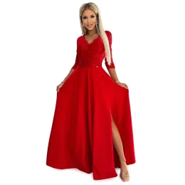 Dámske šaty 309-8 AMBER NUMOCO - červená farba - elegantný strih - trojštvrťové rukávy - krajkové šaty s výstrihom - s rázporkom