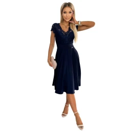 Dámske šaty 381-4 LINDA NUMOCO - tmavomodré - šifónové šaty - čipkový výstrih - krátke rukávy - naberaná sukňa