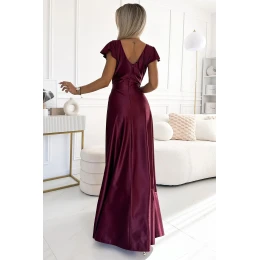 Dámské šaty 411-10 CRYSTAL NUMOCO - bordó barva - dlouhé saténové šaty s dekoltem - krátké rukávky zakončené volánky - hluboký výstřih ozdobený překřížením - dlouhý rozparek - délka až na zem - vhodné na plesy - zapínání vzadu na skrytý zip