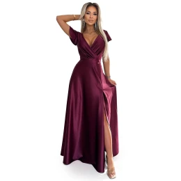 Dámske šaty 411-10 CRYSTAL NUMOCO - bordová farba - dlhé saténové šaty s výstrihom - krátke rukávy s volánmi - hlboký výstrih zdobený crisscrossom - dlhý rozparok - dĺžka po zem - vhodné na plesy - vzadu skrytý zips Zloženie materiálu: 95% polyester + 5% elastan