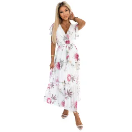 Dámske šaty 434-6 LISA Numoco basic - biele - kvetinový vzor - šifónové midi šaty - hlboký výstrih - volániky na ramenách