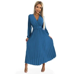 Dámske šaty 504-5 VIVIANA Numoco basic - džínsová farba - z hebučkého materiálu - plisované midi šaty - dlhé rukávy - ceruzkový výstrih - široký opasok