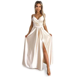 Dámske šaty 512-3 JULIET NUMOCO - béžové - vyrobené z lesklého, hladkého a mierne elastického saténu - elegantné dlhé maxi šaty - ramienka - prekrížený výstrih - dlhý rozparok - zapínanie na zips na chrbte - ideálne na svadby, plesy, Silvester a podobné udalosti