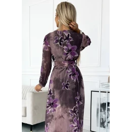 Dámské šaty 520-1 Numoco basic - z šifónového materiálu s podšívkou - vzorované - dlouhé řasené šaty - psaníčkový výstřih - dlouhé rukávy - široký pásek
