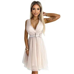 Dámske šaty 523-3 Numoco basic - béžová farba - vyrobené zo vzdušného tylu - provokatívny výstrih - saténová mašľa - zadná časť z elastického materiálu - elegantné nariasenie spodnej časti