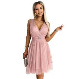 Dámske šaty 525-2 OLGA Numoco basic - staroružové - tylové šaty - srdiečkový výstrih s ozdobným zapínaním - široké ramienka - chrbát z elastického materiálu