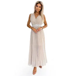 Dámske šaty 546-1 Numoco basic - béžové - vyrobené z pruhovaného šifónu - bez rukávov - lodičkový výstrih - široký opasok
