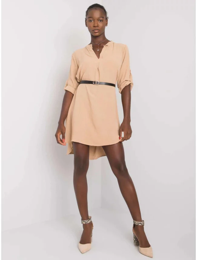 Módne košeľové šaty/tunika s výstrihom do V a manžetovými rukávmi.súčasťou výrobku je úzky čierny pás.asymetrický lem vzadu je dlhší.nepružný a vlnitý materiál.