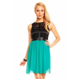 Dámské šaty, které se hodí na párty nebo večírek. Tento model je bez rukávů a bez výstřihu. Velmi rafinovaně působí horní část těchto šatů. Horní díl je krajkový a přešitý pruhy látek, pod krajkou je podšívka, která má střih korzetu. V zadní části je krajka pouze v oblasti lopatek. V pase je koženka, která rozděluje barevné části šatů. Spodní díl sukně je ze dvou vrstev. Spodní díl má krásně zelenou barvu, nikoli mint. Zapínání těchto šatů je v zadní části všitým zipem, který je tak velmi nenápadný. Oblečte si tyto šaty na večírek, večerní posezení s přáteli nebo jinou příležitost a budete mít ten nejzajímavější model.