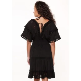 Dámské šaty značky LingaDore. Šaty jsou ušity ze 100% bavlny, proto jsou vhodné pro horké letní dny. Jsou v délce po kolena s krátkým rukávem. Vzadu i vpředu je hluboký výstřih do V. Pod prsy je našita pružná část, která krásně tvaruje postavu. Vrchní část šatů je řešena ve stylu madeira, se třemi krajkovými pásky posetými malými střapci. Ve spodní části je mezi látkou našitý háčkovaný pruh a lemování tvoří nařasená krajka.