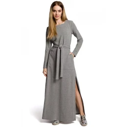 Dlhé šaty do chladnejšieho počasia, štvorcový výstrih, dlhé rukávy, sukne do A s vysokým rozparkom, v páse opasok na zaviazanie, po stranách veľké našité vrecká.