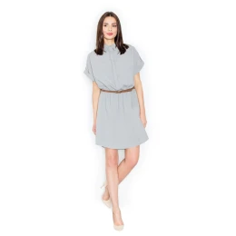 Ľahučké košeľové minišaty širšieho strihu, pri krku golier so zapínaním na patent, krátke rukávy, sukne vpredu aj vzadu doguľata, v páse tenký opasok.
