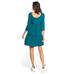 Mini šaty s 3/4 rukávy a lodičkovým výstřihem. Šaty jsou vyrobeny z volánků s rozšířeným střihem. Konstrukce jistě zakryje případné nedokonalosti těla a neomezuje v pohybu. Hluboký výstřih na zádech.