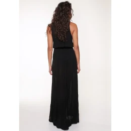 Dámské šaty od oblíbené značky LingaDore. Šaty jsou dlouho ve stylu "maxi". Šaty jsou bez rukávů, mají velký výstřih do "V" na kterém jsou našité šňůrky s třásněmi a okolo kterého jsou našitá lesklá kolečka. V pase mají šaty našitou gumku, která drží hezký tvar šatů. Na bocích mají šaty vysoký výstřih.