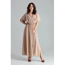 Béžové dlouhé šaty s krátkými kimonovými rukávy zakončenými manžetou. Dlouhá sukně je v pase přestřižená, mírně rozšířená s bočními rozparky. Pas s všitou gumičkou. Obálkový výstřih.