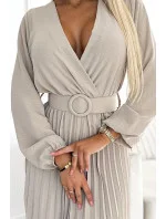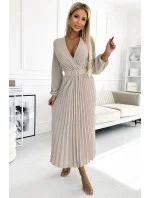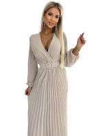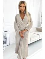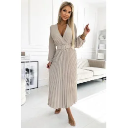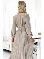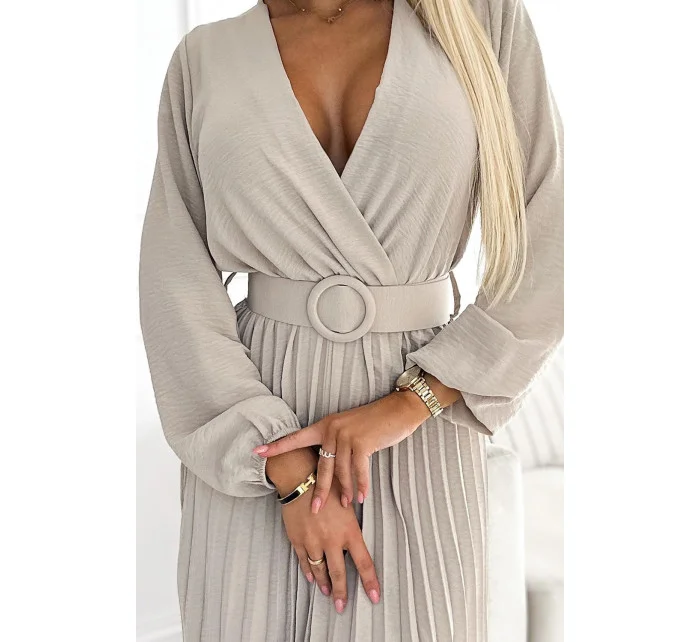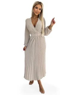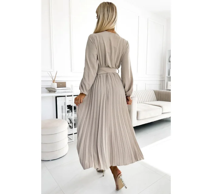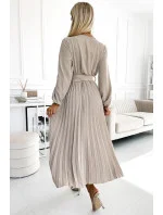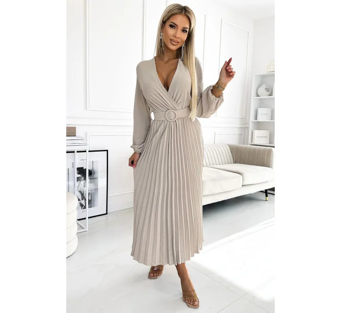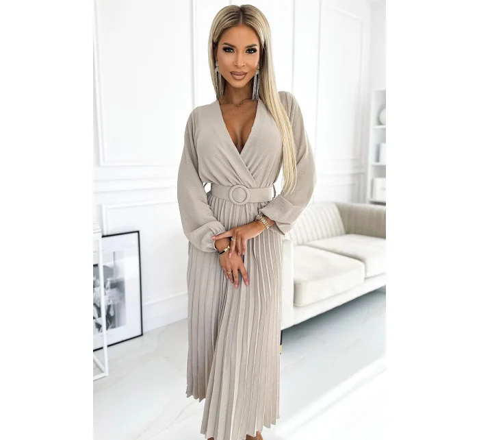 Dámské šaty 504-2 VIVIANA Numoco basic - béžová barva - z mačkavého materiálu - plisované midi šaty - dlouhé rukávy - psaníčkový výstřih - široký pásek