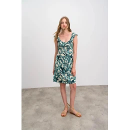 Elegantní dámské šaty s motivem listů s kulatým zřaseným volánovým výstřihem, vše co žena v parných letních dnech potřebuje. Šaty jsou vyrobené z kvalitní jersey viskózy s příměsí elastanu. Jersey Viscoza se vyznačuje vysokou savostí, je dobře prodyšná, měkká a příjemná na dotek a elastan zaručuje lepší pružnost tkaniny.