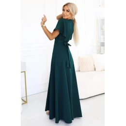 Dámské šaty 581-8 JENNIFER NUMOCO - zelená barva - z lesklého brokátu - krátké rukávy - psaníčkový výstřih - dlouhý rozparek - vypasovaný střih s páskem