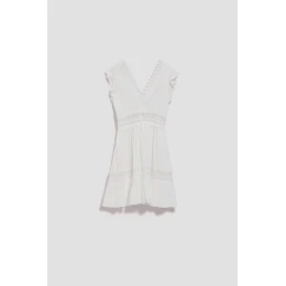 Bílé šaty. Hladký materiál, žádné vzory. Krátké volánové rukávy. Výstřih do V, zdobený krajkou. Z viskózy, lehkého materiálu zdobené krajkou. Zapínání na zip pro snadné nazouvání. Navíc má podšívku. Rozšířený střih, směrem dolů se mírně rozšiřující. Délka nad kolena. Ideální volba pro zvláštní příležitosti a významné události.