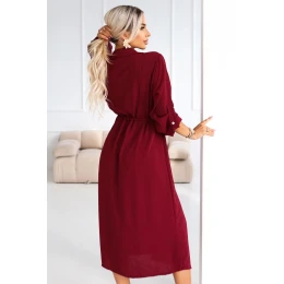 Dámské šaty 651-2 Numoco basic - bordó barva - košilové midi šaty - tříčtvrteční rukávy s manžetou - s límcem - zapínání na knoflíky - zvýraznění pasu nastavitelným páskem