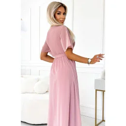 Dámské šaty 545-1 Numoco basic - starorůžová barva - z šifónu - krátké volánkové rukávy - nabíraný výstřih - zavazování v pase