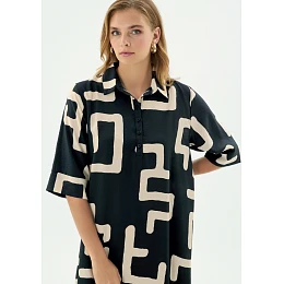 Košilové šaty z viskózy s délkou rukávu po lokty jsou elegantním a pohodlným kouskem vhodným pro každodenní nošení i slavnostnější příležitosti. Šaty jsou do poloviny těla propínací. Lehký materiál krásně splývá a zajišťuje volnost pohybu. Rukávy sahají po lokty a dodávají šatům sofistikovaný vzhled, zatímco spodní volán jemně zvýrazňuje ženskou siluetu a přidává šatům hravý, vzdušný detail.