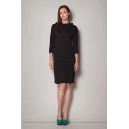 Dámské elegantní šaty M181 FIGL jednoduchého střihu s lodičkovým výstřihem. 3/4 rukávy jsou zakončeny lemem stejně tak i výstřih. Šaty jsou volnějšího střihu s délkou nad kolena. Materiálové složení:96% polyester + 4% elastan