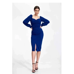 Midi koktejlové šaty z elastické látky s dlouhými bufetovými rukávy zakončenými nerozpáranou manžetou. Stahovací výstřih. Ozdobné řasení vpředu a vzadu po celé délce šatů. Jemný rozparek ve spodní části předního dílu. Šaty bez podšívky a bez zapínání.