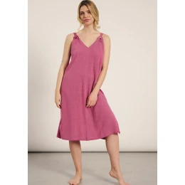 Dámske plážové šaty značky Muydemi. Šaty sú vyrobené z ľanu a viskózy, ideálne na horúce letné dni. Šaty majú voľný, jednoduchý strih s dĺžkou pod kolená. Výstrih je v tvare písmena V. Šaty majú širšie ramienka a rozparky na bokoch.