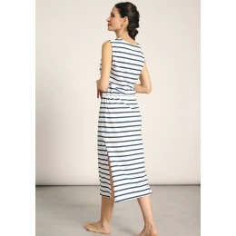 Dámské plážové šaty značky Muydemi. Šaty jsou vyrobeny z jemné bavlny, ideální pro horké letní dny. Šaty jsou volné, jednoduchého střihu s délkou pod kolena. Výstřih je do tvaru V. Šaty mají široké ramínka a na bocích mají rozparky. Šaty mají okrasnou šňůrku v pase, kterou lze šaty stáhnout.