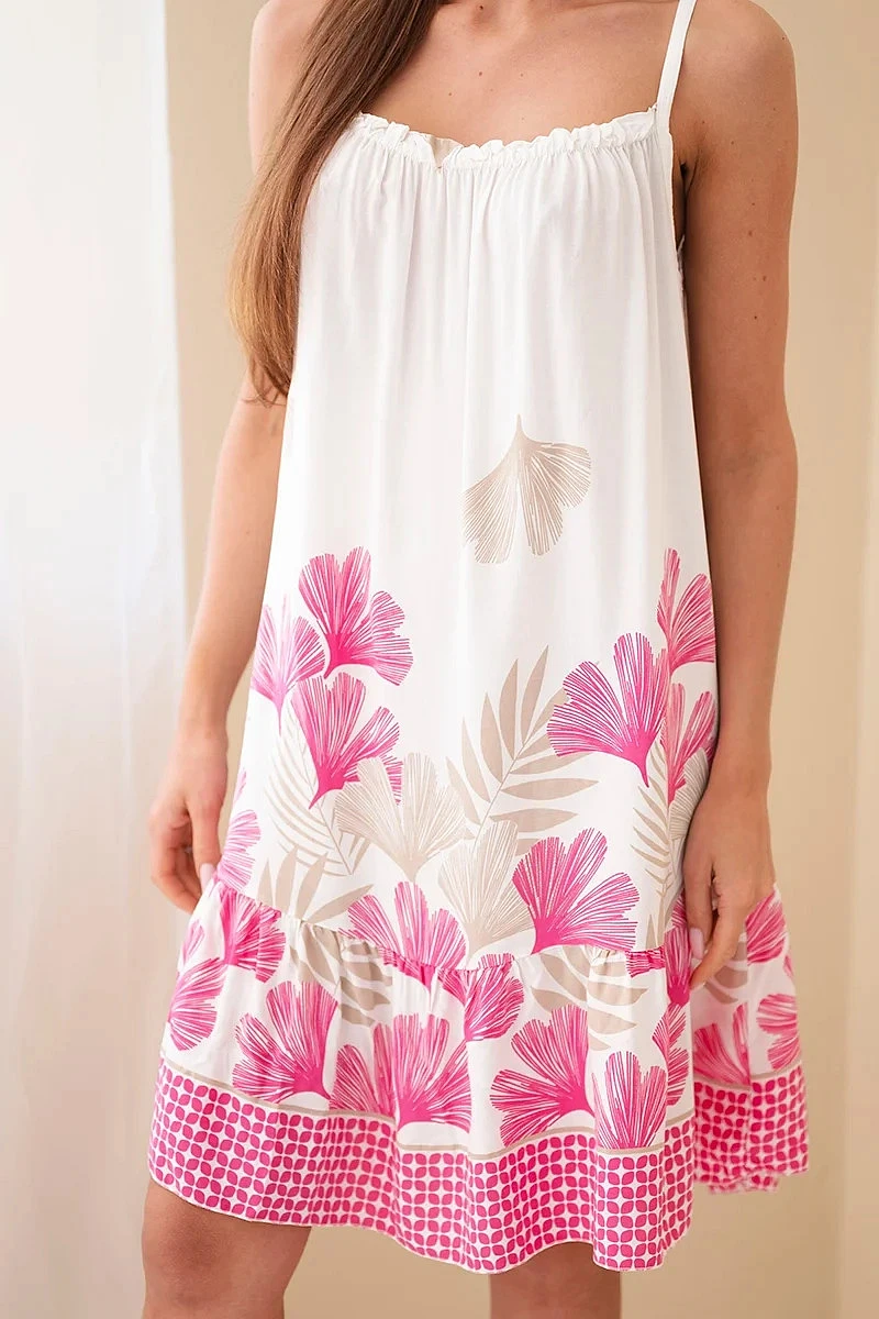 Tieto dámske šaty bez ramienok s potlačou sú ideálnou voľbou na teplé dni pre ženy, ktoré oceňujú ľahkosť a pohodlie v módnom dizajne. Vďaka vzdušnému strihu sa šaty krásne prispôsobia postave a zabezpečia voľnosť pohybu a pohodlie pri celodennom nosení. Vrchnú časť modelu zdobí jemné riasenie, ktoré decentne zvýrazňuje výstrih a dodáva celku ženský charakter. Tenké ramienka dodávajú šatám ľahkosť a sú skvelou voľbou na leto, dovolenku alebo prechádzku po meste.