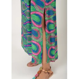 Zahalte se do barev léta s těmito výraznými maxi šaty od francouzské značky Terre Rouge. Lehký a vzdušný materiál vyniká originálním barevným potiskem v odstínech zelené, růžové a modré, který okouzlí na první pohled. Šaty mají zavinovací výstřih do V, elastický pas se stahovací šňůrkou a rozparky po stranách, které dodávají volnost pohybu a špetku elegance. Ideální volba na dovolenou, procházku městem i letní večírek.