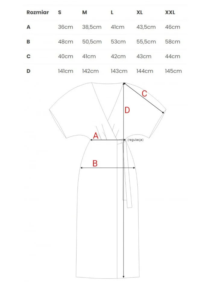 materiál: ľahká viskóza Povrchová úprava: hladká, saténová PODROBNOSTI O PRODUKTE Pás: klasický strih s opaskom na zaväzovanie, ktorý zvýrazňuje pás Zapínanie: zaväzovanie v páse, zavinovací strih Rukávy: voľné, dĺžka po lakte Vrecká: žiadne Model: S406 Navrhnutý a vyrobený v Poľsku Modelka je vysoká 170 cm a má na sebe veľkosť S STYLE AND CUT Strih: zavinovací strih Tvar: zopnutý pás, splývavý pozdĺž tela Dĺžka: maxi dĺžka