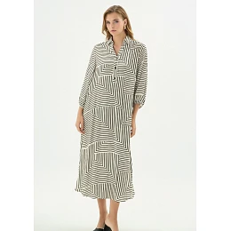 Tieto dámske viskózové šaty s jemným prúžkovaným vzorom sú elegantným a pohodlným kúskom vhodným na každodenné nosenie do práce alebo na voľný čas. Ľahký materiál je príjemný na dotyk a krásne splýva, čo zaručuje pohodlie počas celého dňa. Pri krku majú šaty golier s preloženou légou, ktorý modelu dodáva elegantný a nadčasový vzhľad. 3/4 dlhé rukávy sú ľahko nabrané do gumy, čo im dodáva jemný naberaný efekt a voľnosť pohybu. Vďaka univerzálnemu strihu a decentnému dizajnu sa šaty ľahko kombinujú s doplnkami a obuvou na rôzne príležitosti.