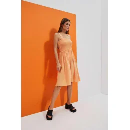 Mimoriadne ženské šaty s otvorenými ramenami, široké ramienka. Oranžová farba. Hladké, bez vzorov. Vrchná časť šiat je vo forme šnúrky. Dokonale sa prispôsobí postave a zvýrazní ženské tvary. Spodná časť šiat je voľná, voľná a rozšírená. Dĺžka nad kolená. Vyrobené z na dotyk príjemnej a vzdušnej viskózy. Ideálne na pláž a každodenné štylizácie. Perfektné na leto, musíte ich mať!