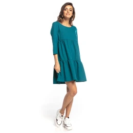 Mini šaty s 3/4 rukávmi a lodičkovým výstrihom. Šaty sú vyrobené z volánikov s rozšíreným strihom. Konštrukcia určite zakryje prípadné nedokonalosti tela a neobmedzuje v pohybe. Hlboký výstrih na chrbte.