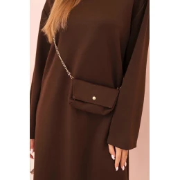 Detaily: taška na zlatém řetízku, dlouhý rukáv, kulatý výstřih